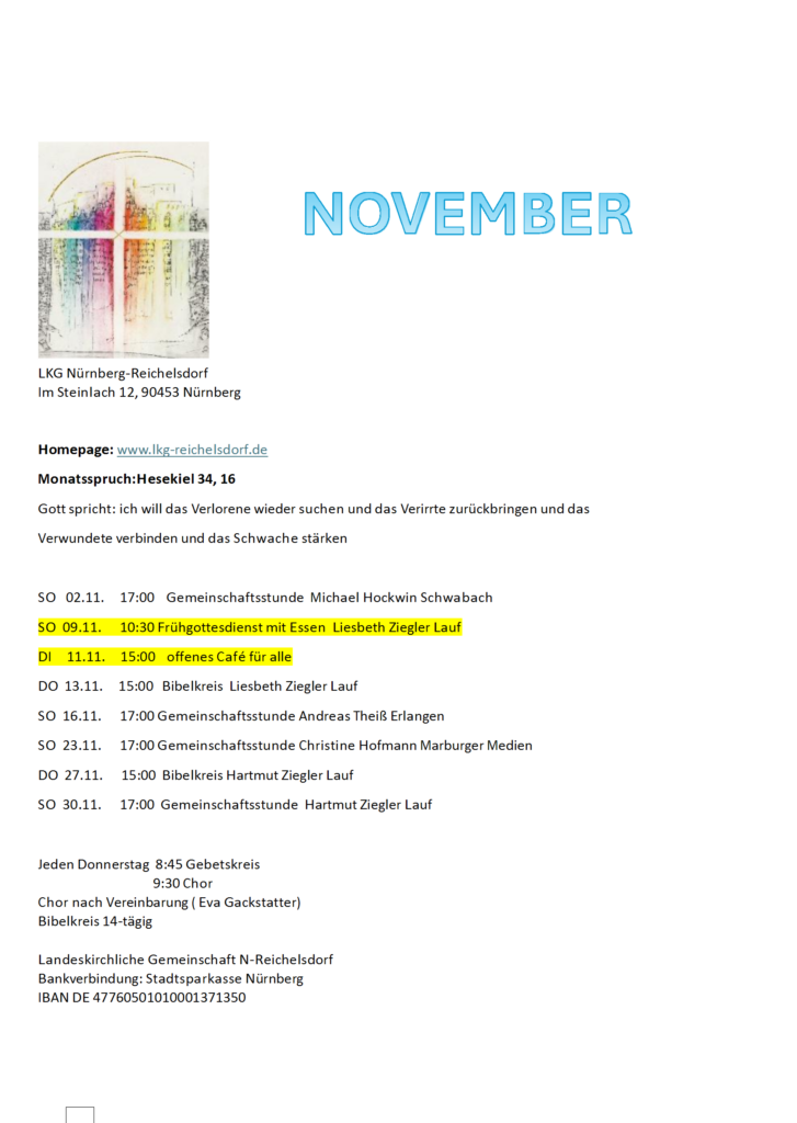 Programm Lust auf guten Kaffee und leckeren Kuchen in geselliger Runde und angenehmer Gesellschaft?Sie sind herzlich eingeladen zum "Offenen Café" am Dienstag, den 11.11.25um 15 Uhrin der Landeskirchlichen Gemeinschaft Reichelsdorf, Im Steinlach 12